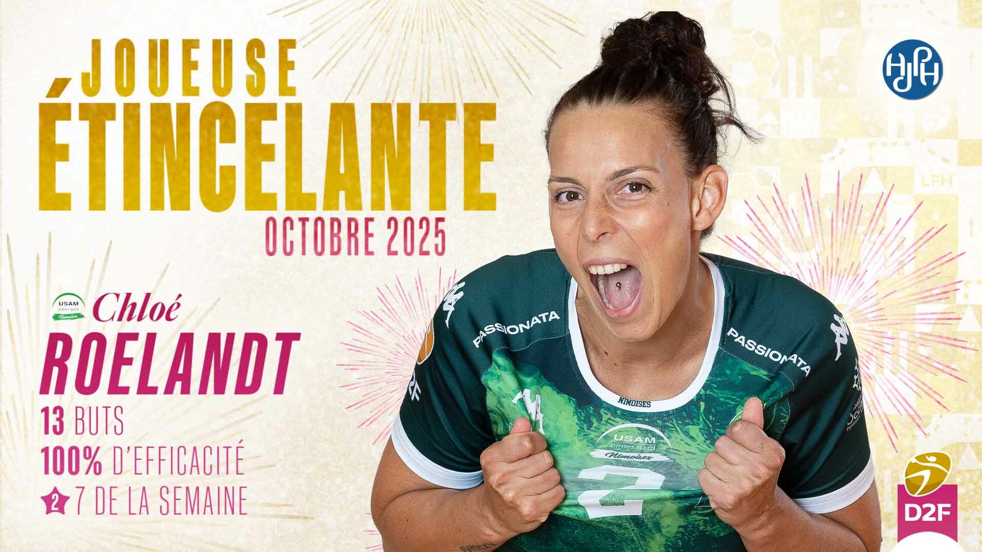 La pivot de l’USAM Nîmes Gard NîmoisesChloé ROELANDT, remporte le trophée de la Joueuse Étincelante du Mois d’octobre de la saison 2025-2026 de Division 2 Féminine. Ayant récolté 52% des voix, elle se hisse ainsi sur la première marche d’un podium complété par l’ailière gauche et capitaine de Saint-Grégoire Rennes Métropole HandballEden DUMOULIN (28% des voix) et l’arrière gauche Assa SISSOKO-DABO (La Roche-sur-Yon Vendée Handball, 20% des voix).