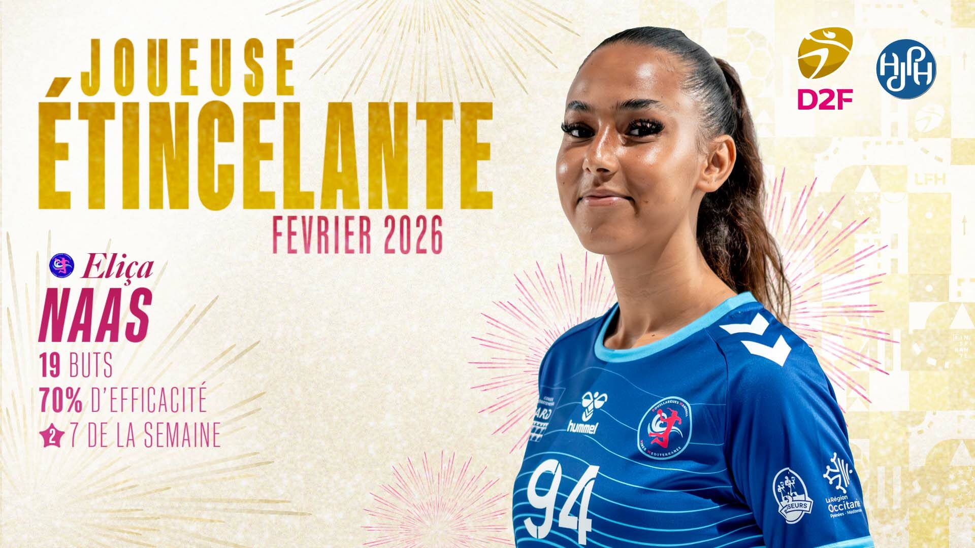 L’ailière droite du Bouillargues Handball Nîmes Méditerranée, Eliça NAAS, remporte le trophée de la Joueuse Étincelante du mois de février en Division 2 Féminine. Ayant récolté 44% des voix, elle se hisse ainsi sur la première marche d’un podium complété par la gardienne du Pouzin HB07Sephora JEANNE LOUISE, avec 30% des voix, et l’arrière gauche Léa LACROIX, coéquipière en club de la grande gagnante du mois, avec 26% des voix.