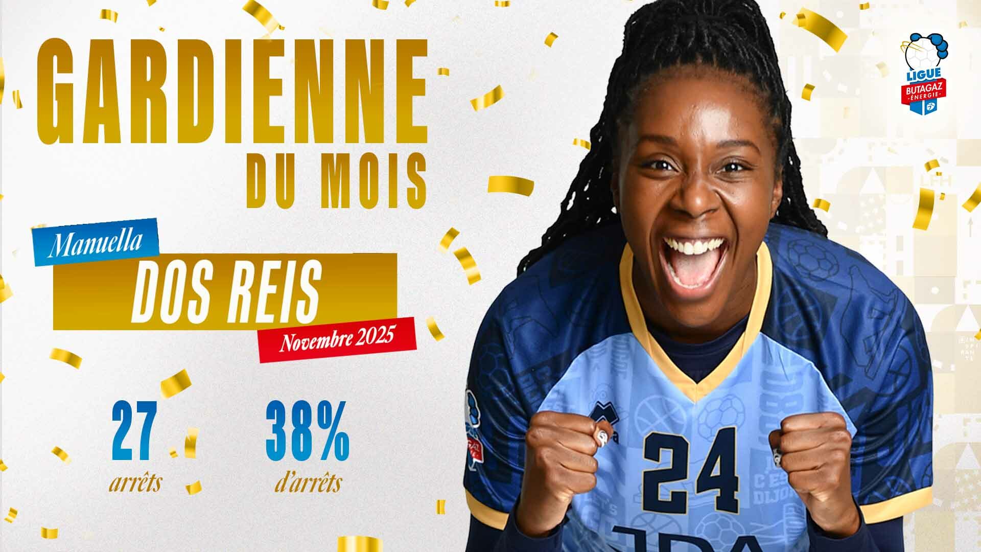 Elle a fait preuve d’une grande solidité au cours du mois de novembre ! Comptabilisant un total de 27 arrêts pour un taux d’arrêts s’élevant à 38% en Ligue Butagaz Énergie, Manuella DOS REIS a grandement contribué aux deux succès décrochés en autant de rencontres par la JDA Bourgogne Dijon Handball, et remporte ainsi le titre de meilleure gardienne de novembre.